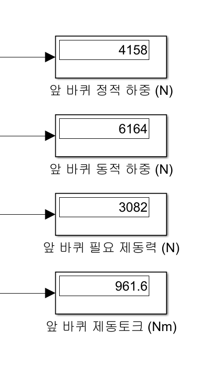 100km/h에서 정지 시 32m 이내로 정지할 수 있어야 한다는 요구사항을 토대로 앞서 만든 시뮬링크 모델에 대입하여 앞바퀴에 작용하는 동적 하중 값(6164N)을 추출하였다. 이 값을 토대로 시뮬레이션을 진행한다.